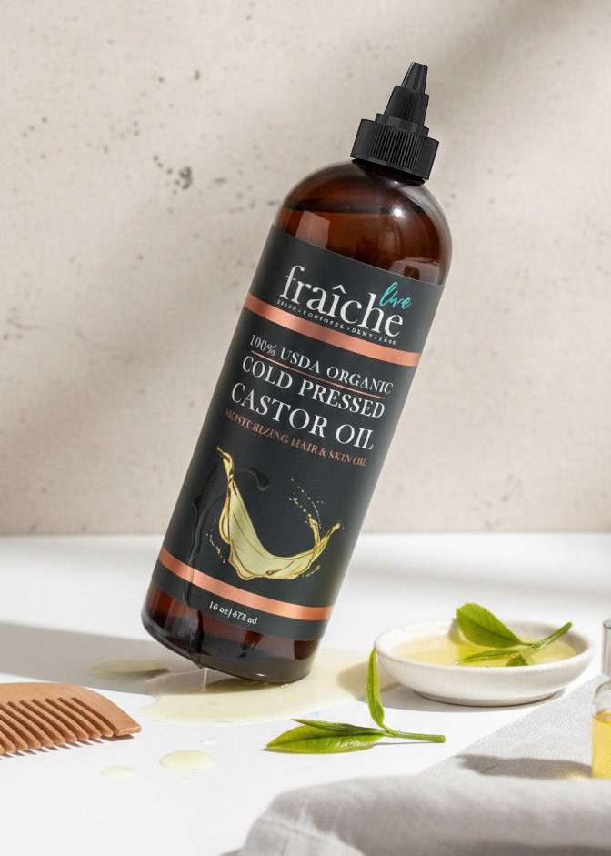 Castor oil works because it is rich in ricinoleic acid and powerful fatty acids that deeply condition, seal in moisture, and create the ideal environment for healthier hair and skin to thrive. Its natural antibacterial properties help keep pores and follicles clear while supporting elasticity, smoothness, and resilience at the surface. When massaged into areas like the abdomen, it is traditionally used to encourage circulation and support the body’s natural drainage process to help relieve the feeling of bloating and fluid retention. Our oil is 100% USDA organic, cold pressed, hexane free, and imported from India to preserve the full potency of its nutrients, making it a pure, gentle, and highly effective way to care for your hair, skin, and body without harsh chemicals.