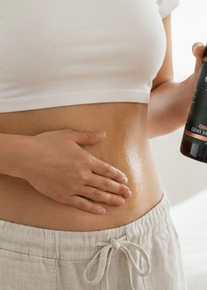 apply a generous amount of castor oil into and around the navel and lower abdomen. Gently massage in circular motions for several minutes to encourage circulation beneath the skin. Leave the oil on for at least 20 to 30 minutes, or place a warm compress over the area to enhance absorption. This traditional method is used to support lymphatic flow, reduce the feeling of bloating, and promote a more comfortable, balanced body.